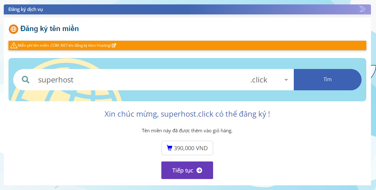 - Sau đó nhấn Tiếp tục nếu tên miền có thể đăng ký được.