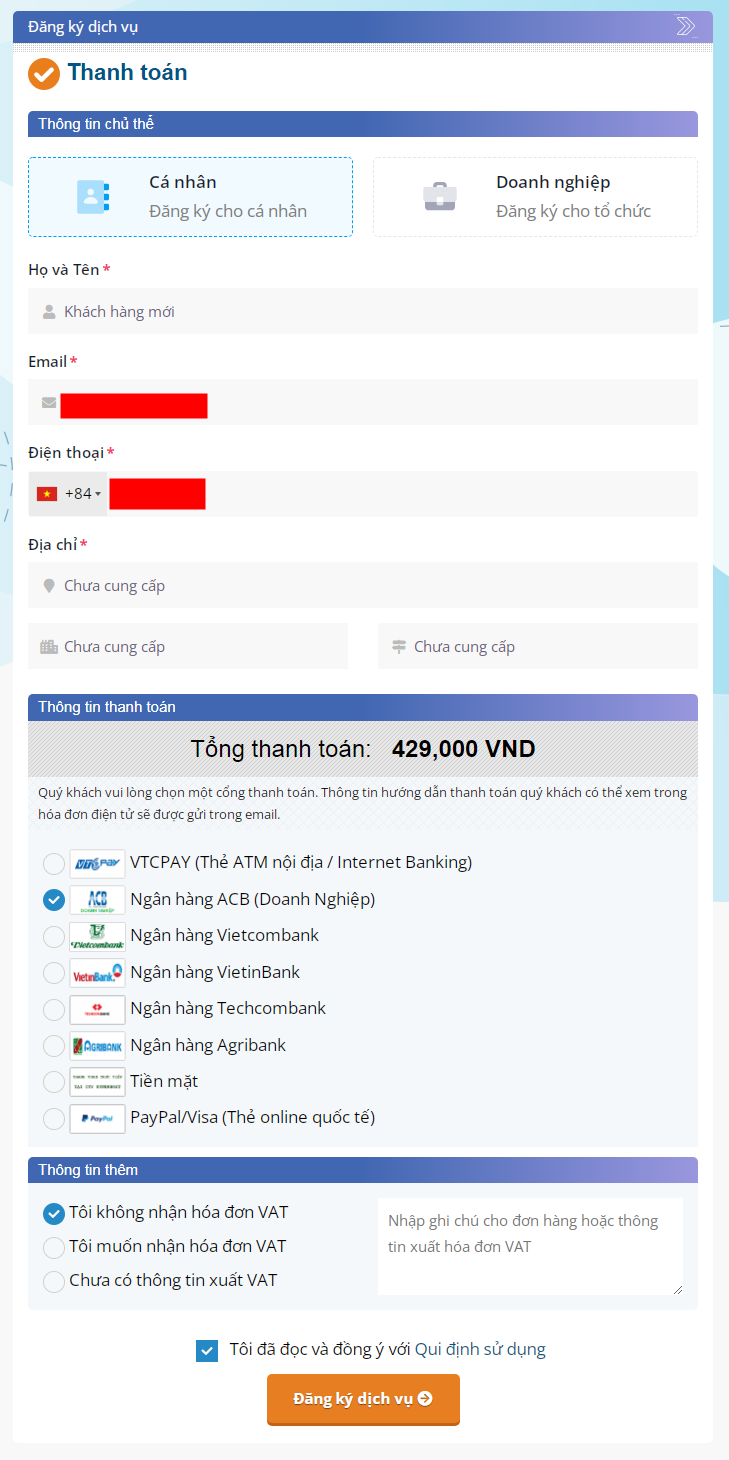 Bạn kiểm tra lại thông tin dịch vụ và nhập mã Khuyến mãi nếu có. Sau đó bạn nhấp vào Thanh toán.