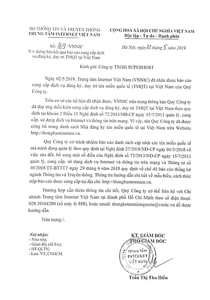 Trong suốt gần 8 năm hoạt động, cty SuperHost đã cung cấp dịch vụ đăng ký tên miền cho hơn 4000 tên miền quốc tế còn đang duy trì hoặc đã hết hạn tại Việt Nam. Với uy tín lâu năm, vào ngày 02/05/2019, cty SuperHost đã được trung tâm Internet Việt Nam (VNNIC) xác nhận đủ điều kiện trở thành nhà đăng ký tên miền quốc tế tại Việt Nam.