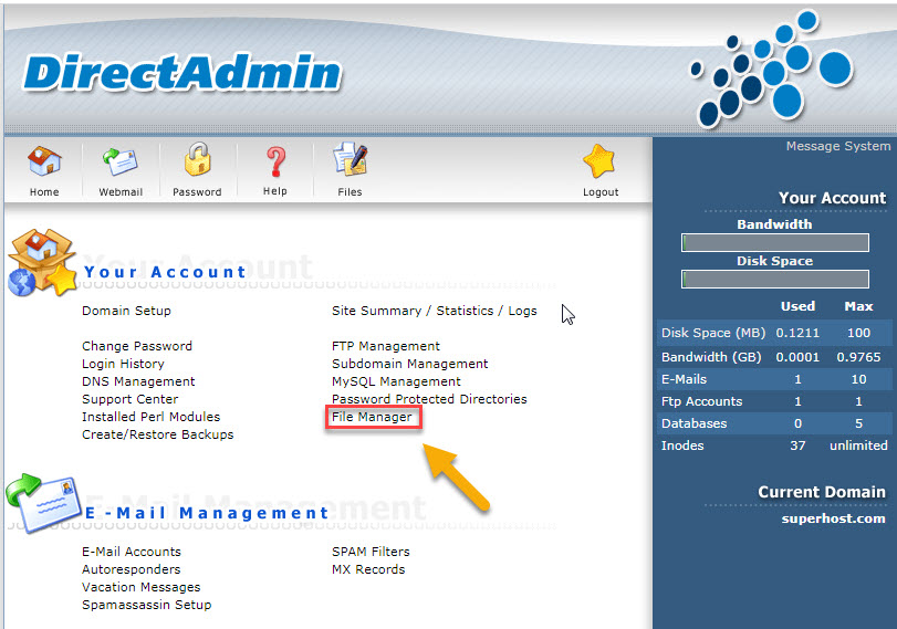 Bước 2: Chọn File Manager => Domain => superhost.com (Tên miền của bạn) => public_html