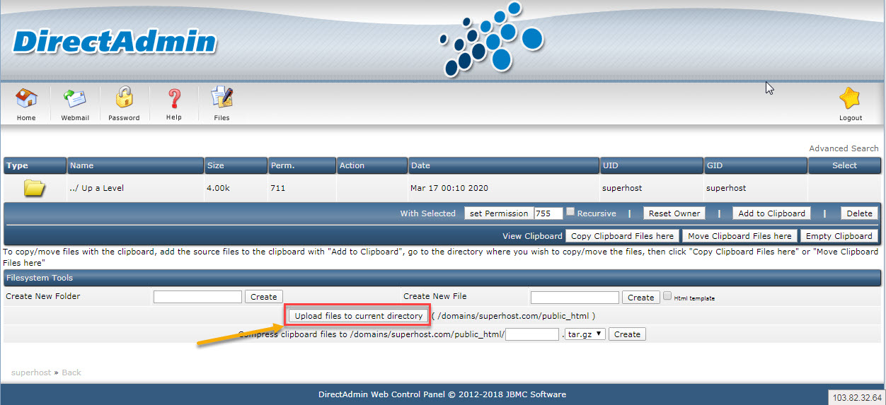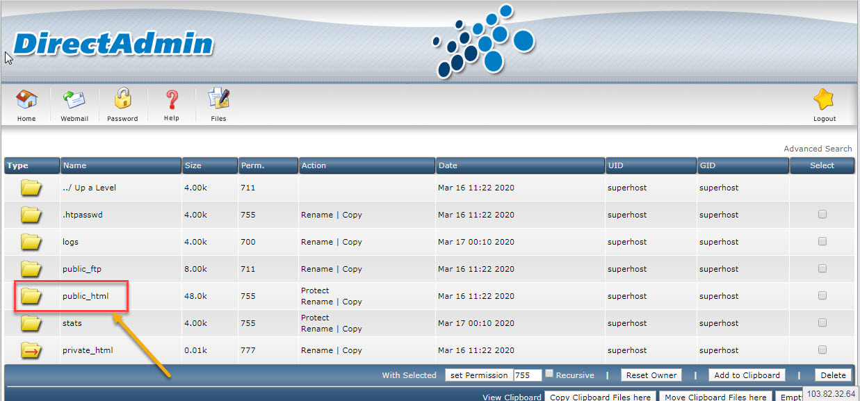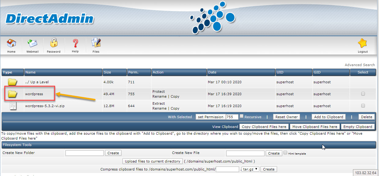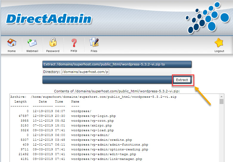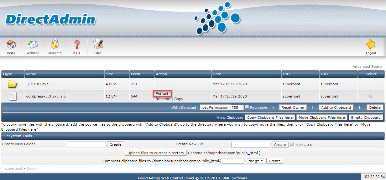 Bước 4: Quay lại thư mục public_html các bạn sẽ thấy file .zip này, các bạn bấm vào extract để Directadmin giải nén file .zip này.