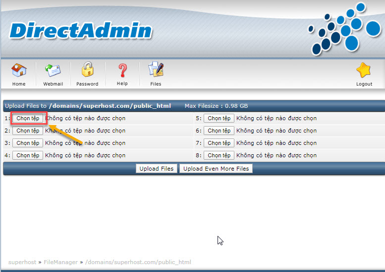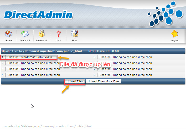 Sau khi đã xóa hết rồi, các bạn upload mã nguồn wordpress khi nãy đã tải về máy tính lên bằng cách chọn như hình dưới đây: