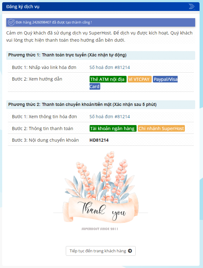 Sau khi bạn thanh toán thành công thì nhà cung cấp Hosting sẽ kích hoạt dịch vụ và gửi cho bạn thông tin tài khoản Hosting. Việc tiếp theo bạn cần làm là tiến hành cấu hình tên miền trỏ về địa chỉ IP của máy chủ Hosting và đưa website của bạn lên Hosting hoạt động. Bạn có thể yêu cầu nhân viên SuperHost hoặc đơn vị cung cấp Hosting hỗ trợ bạn.