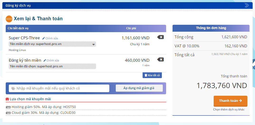 - Chọn chu kỳ thanh toán và Nhập mã khuyến mãi Hosting.