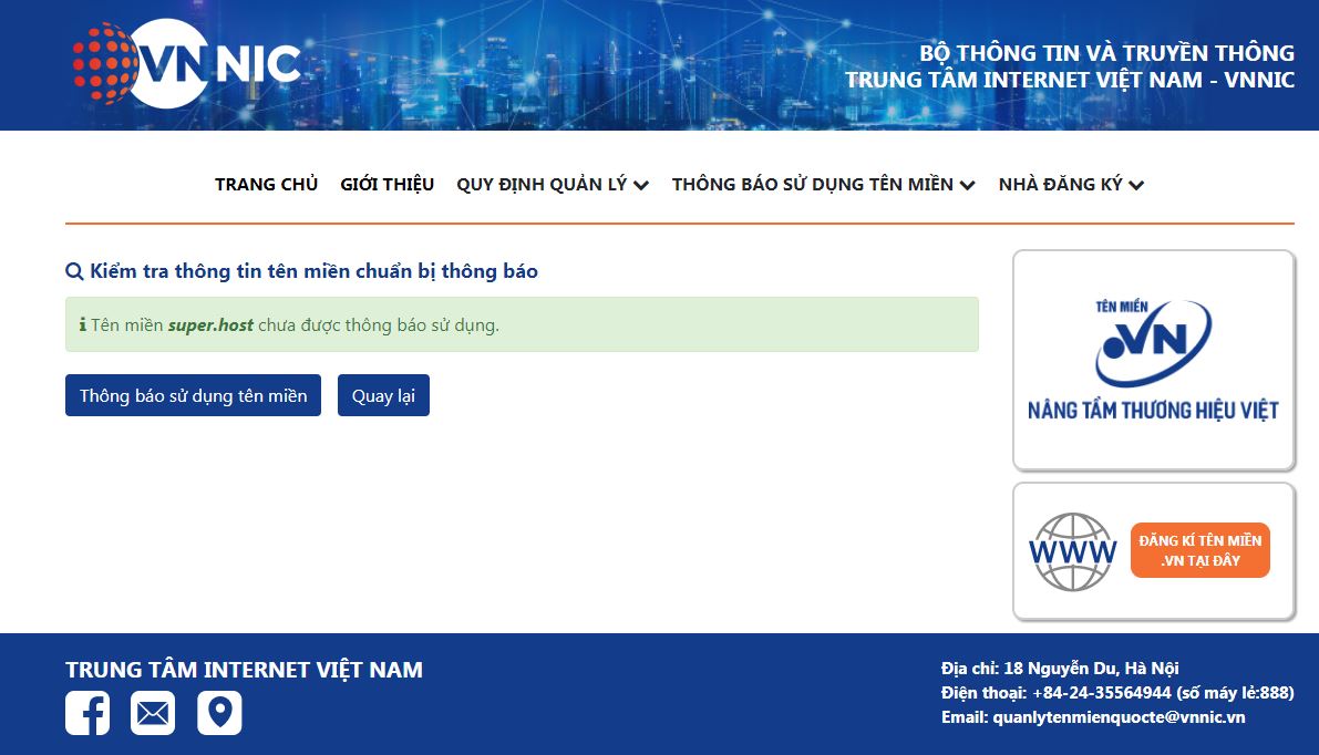 Bước 2: Khi kết quả tra cứu hiển thị tên miền chưa được thông báo sử dụng. Click chọn vào nút Thông báo sử dụng tên miền để tiến hành khai báo các thông tin chủ thể.