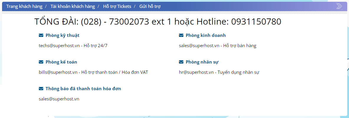 - Livechat: https://chat.superhost.vn/chat.php (Hỗ trợ kinh doanh giờ hành chính, tiếp nhận sư cố khẩn cấp)