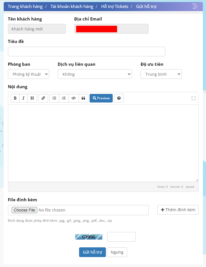 Bạn nhập thông tin Tiêu đề, các dịch vụ có liên quan, chọn độ ưu tiên của vấn đề cần hỗ trợ. Sau đó bạn nhập nội dung và đính kèm file hoặc hình ảnh.