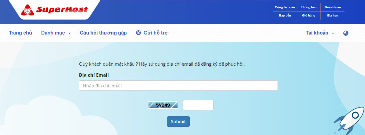 Bạn vào trang trung tâm khách hàng https://central.superhost.vn/clientarea.php, nhập thông tin Email và mật khẩu đăng nhập. Sau đó nhấn Đăng nhập.