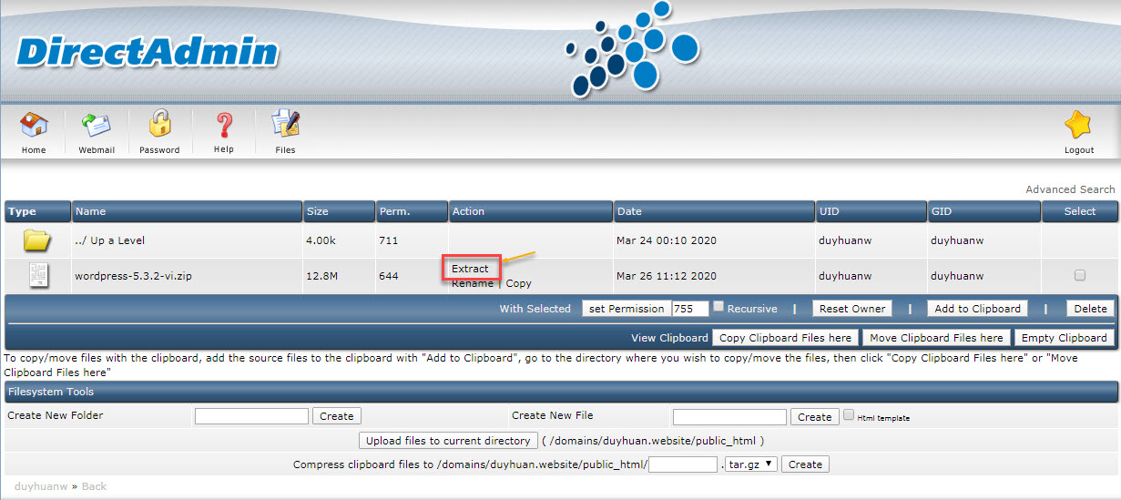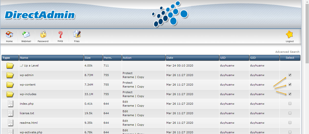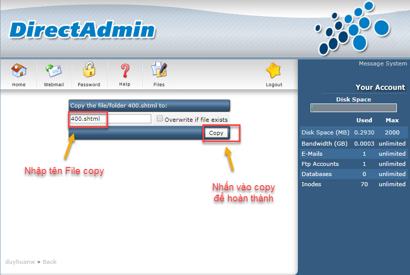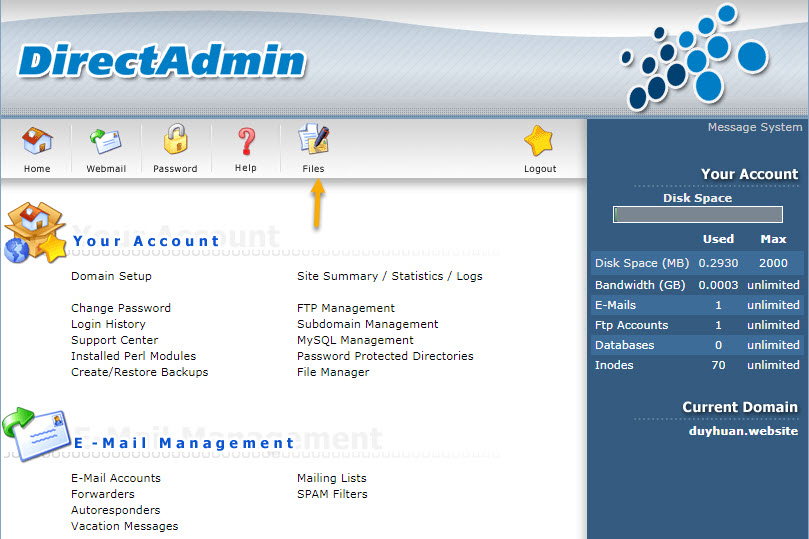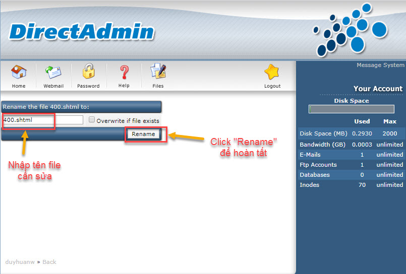 Trước tiên ta login User vào DirectAdmin.