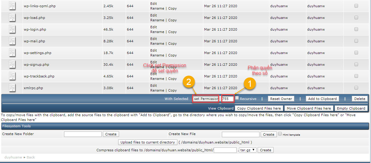 Bước 2: Phân quyền (lưu ý: phân quyền bằng số).