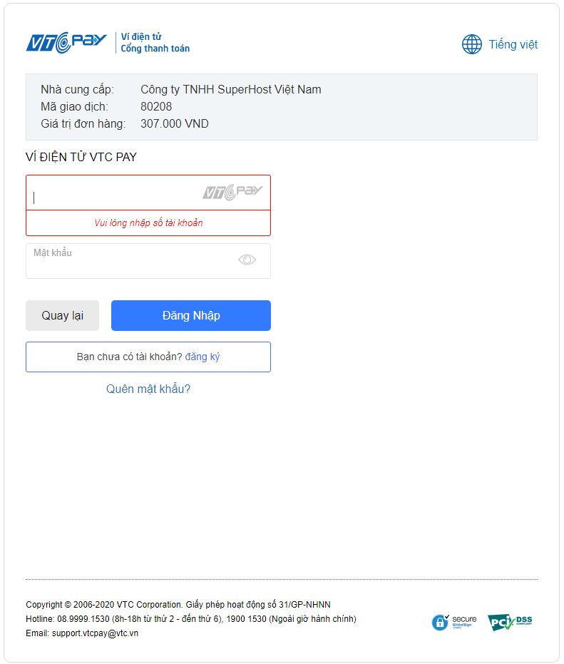 Thanh toán bằng ví điện tử VTCPay là hình thức thanh toán trực tuyến. Điều kiện để bạn có thể thanh toán là bạn chỉ cần đăng ký sử dụng dịch vụ ví điện tử VTCPay tại https://vtcpay.vn/. Ví điện tử VTCPay cho phép bạn liên kết với nhiều ngân hàng, nạp tiền sẵn vào ví VTCPay để thanh toán các loại hóa đơn. SuperHost đã thực hiện đấu nối cổng thanh toán với ví VTCPay, vì vậy bạn có thể thanh toán các hóa đơn của SuperHost bằng cách đăng nhập ví VTCPay hoặc cài đặt Apps của ví VTCPay.