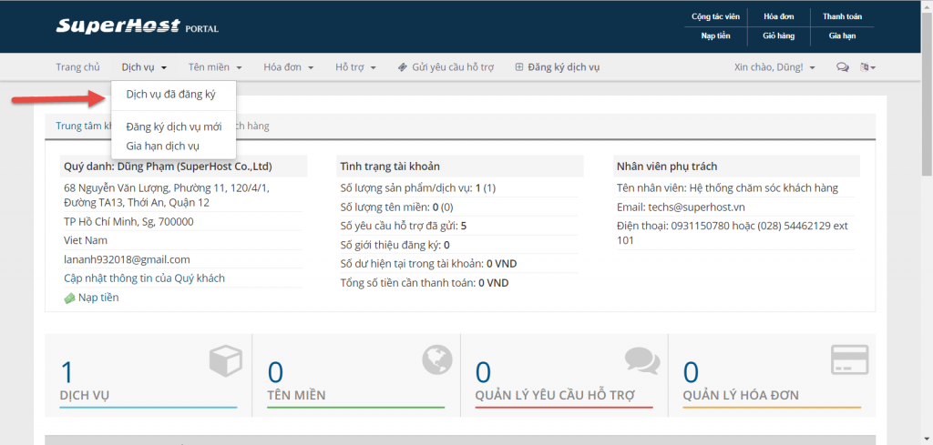 Bước 1: Bạn đăng nhập vào trung tâm khách hàng SuperHost, trên menu ngang chính, bạn chọn Dịch vụ => Dịch vụ đã đăng ký