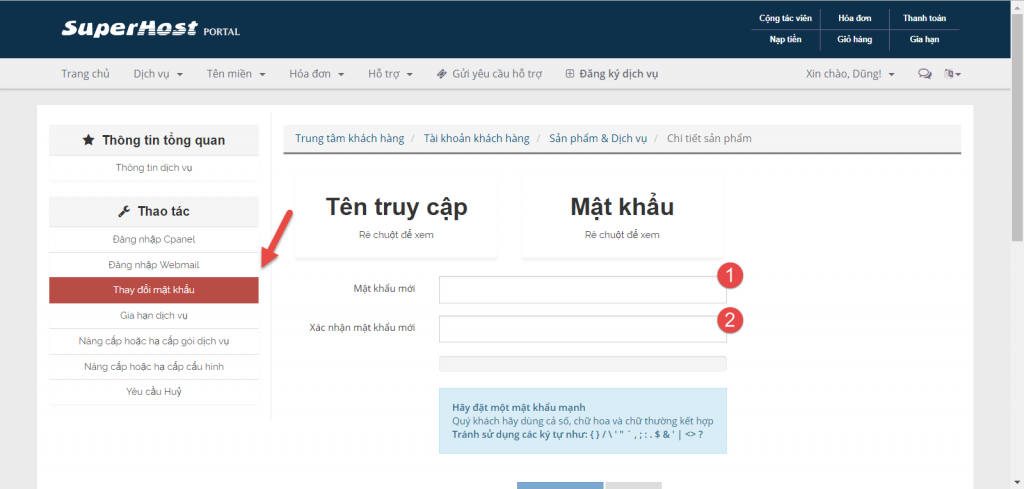 Cách 2 – Thay đổi mật khẩu dịch vụ Hosting cpanel từ trung tâm khách hàng SuperHost