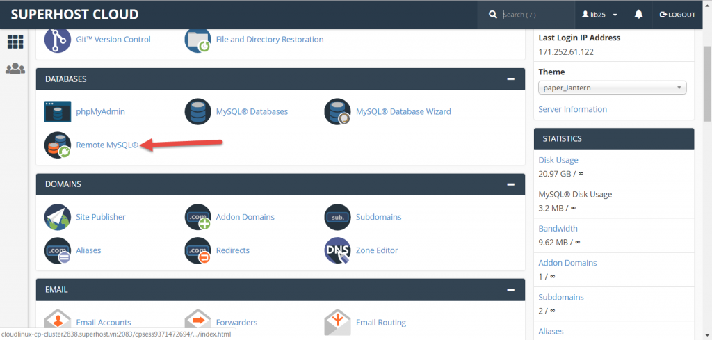 Sau khi tạo Database và User ở bước trên, để có thể quản lý được Database đó từ xa, bạn chọn tiếp mục Remote MySQL
