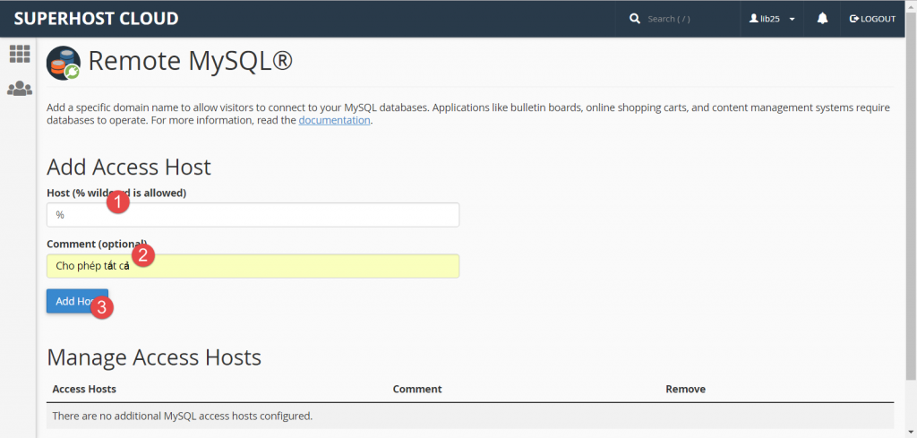 Bạn chọn ký tự % để cho phép tất cả các IP của bạn được phép kết nối vào Database, hoặc điền IP chính xác của bạn vào và bấm Add Host
