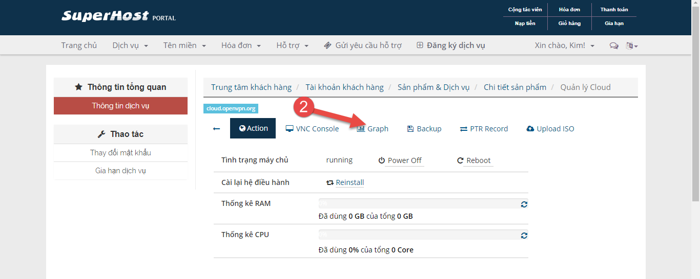 Trong quá trình sử dụng dịch vụ Cloud Server, SuperHost có cung cấp cho bạn chức năng để có thể quan sát tình trạng tài nguyên Cloud Server đang sử dụng trong trung tâm khách hàng. Trong bài viết này chúng tôi sẽ hướng dẫn bạn cách xem tài nguyên bằng chức năng Graph.