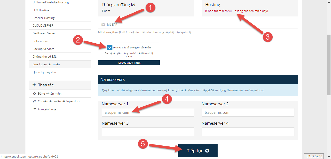 - Check vào nút Dịch vụ bảo vệ thông tin tên miền ( 150,000VND/ 1 năm ) nếu muốn ẩn thông tin tên miền.