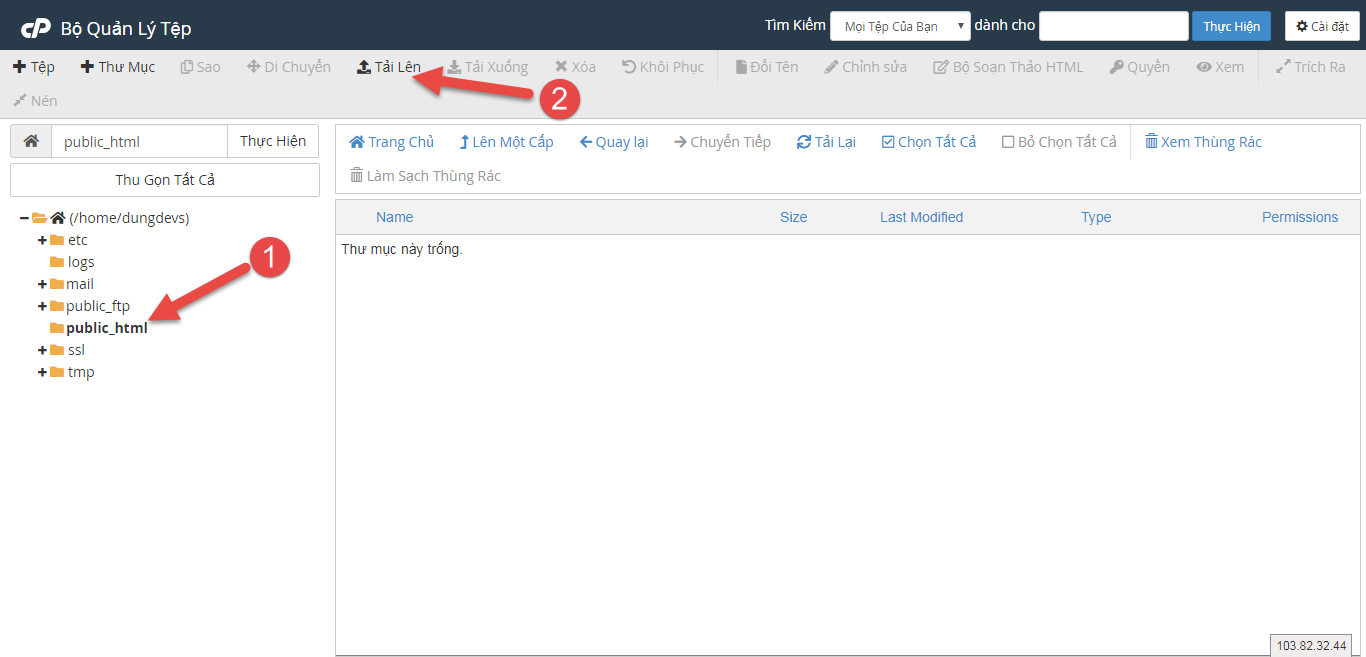 Bước 3: Vào thư mục public_html => Upload ( Tải Lên )