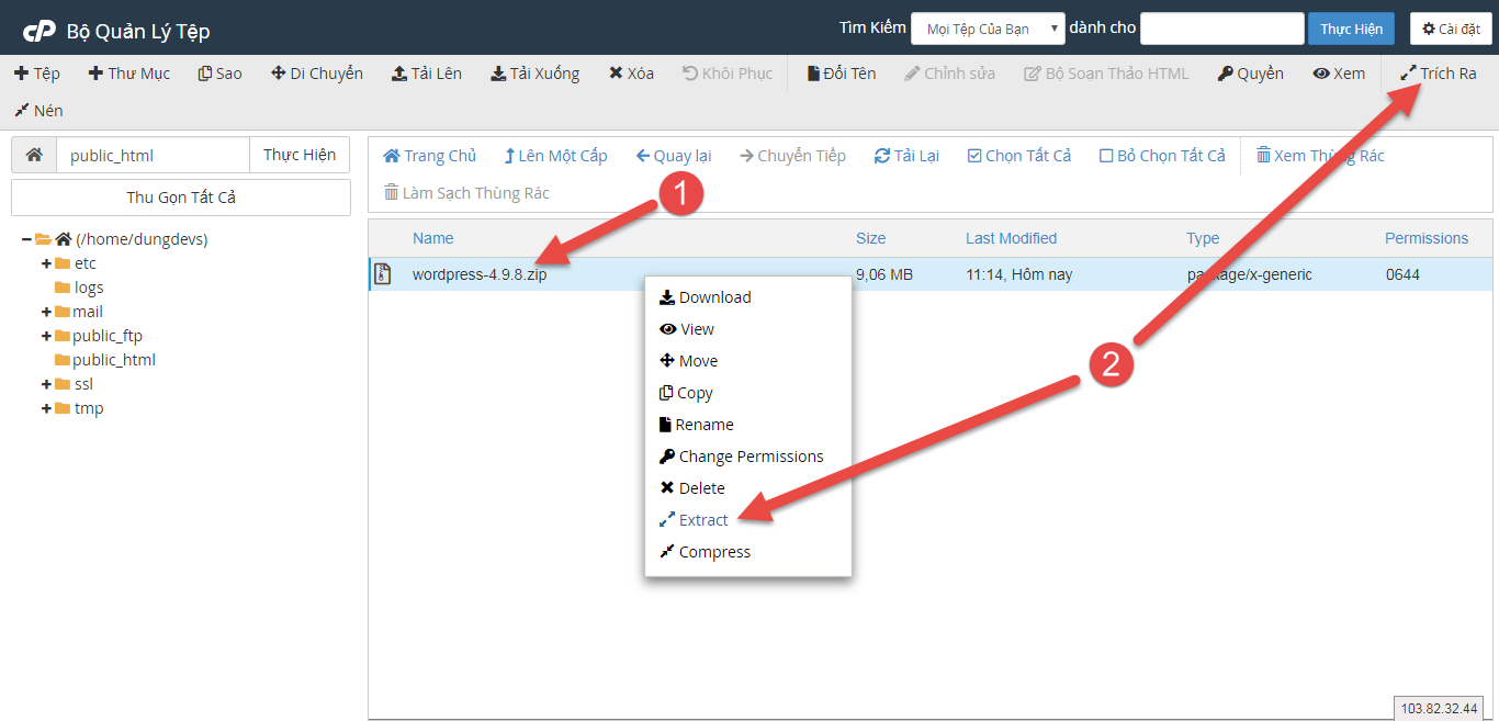 Bước 5: Trở lại trang File Manager chọn Extract ( Trích Ra ) để giải nén mã nguồn.