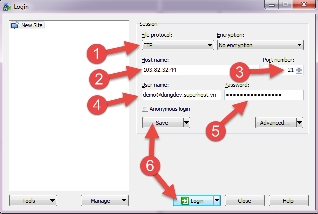 - Username: tài khoản FTP đã tạo ( demo@dungdev.superhost.vn )