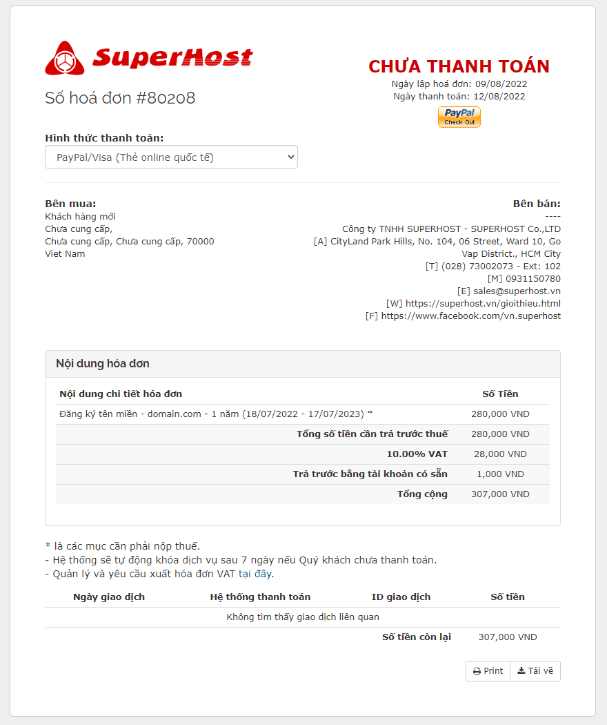 Bạn cũng có thể xem hóa đơn cần thanh toán bằng cách nhấp trực tiếp link hóa đơn được SuperHost gửi trong Email.