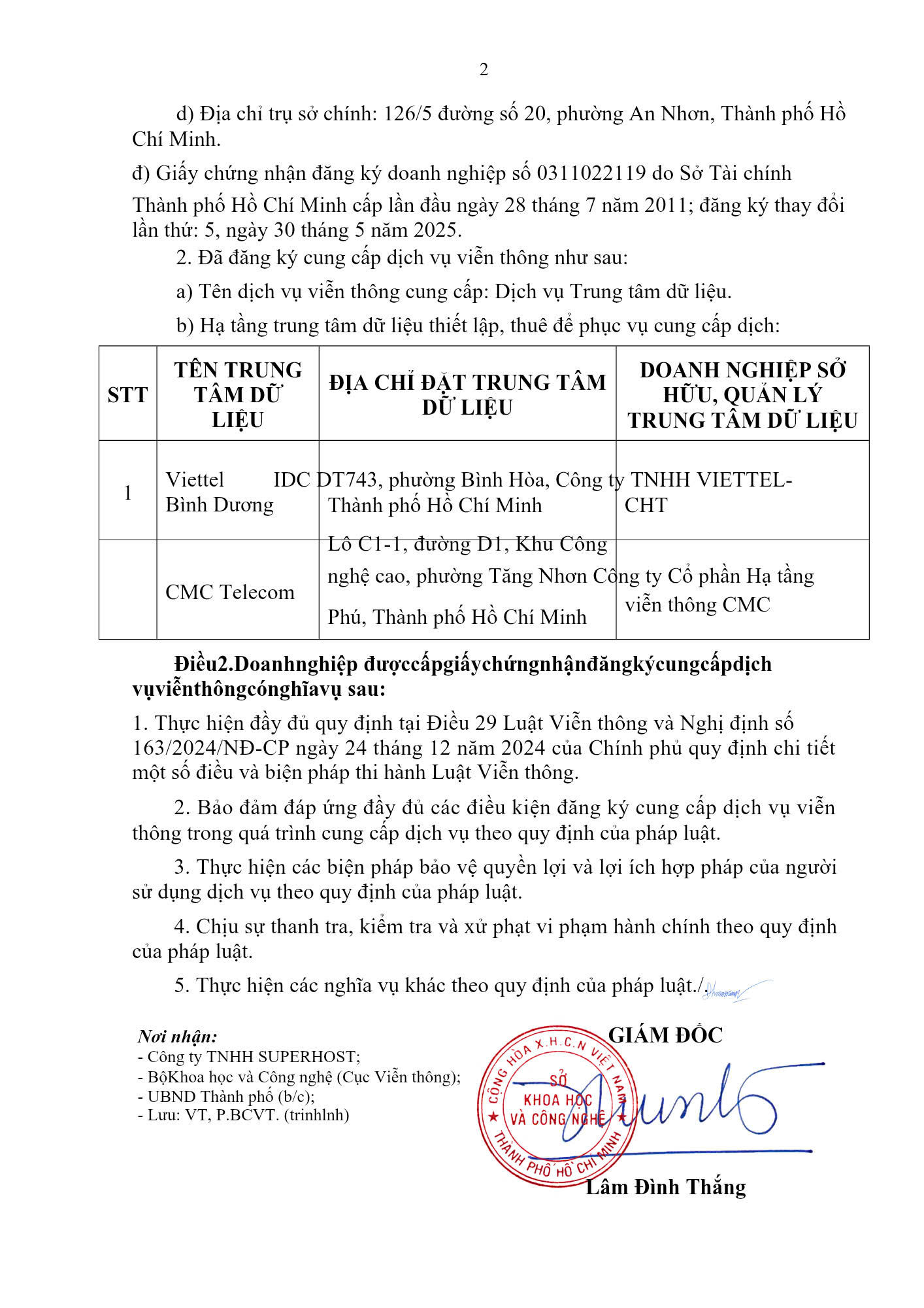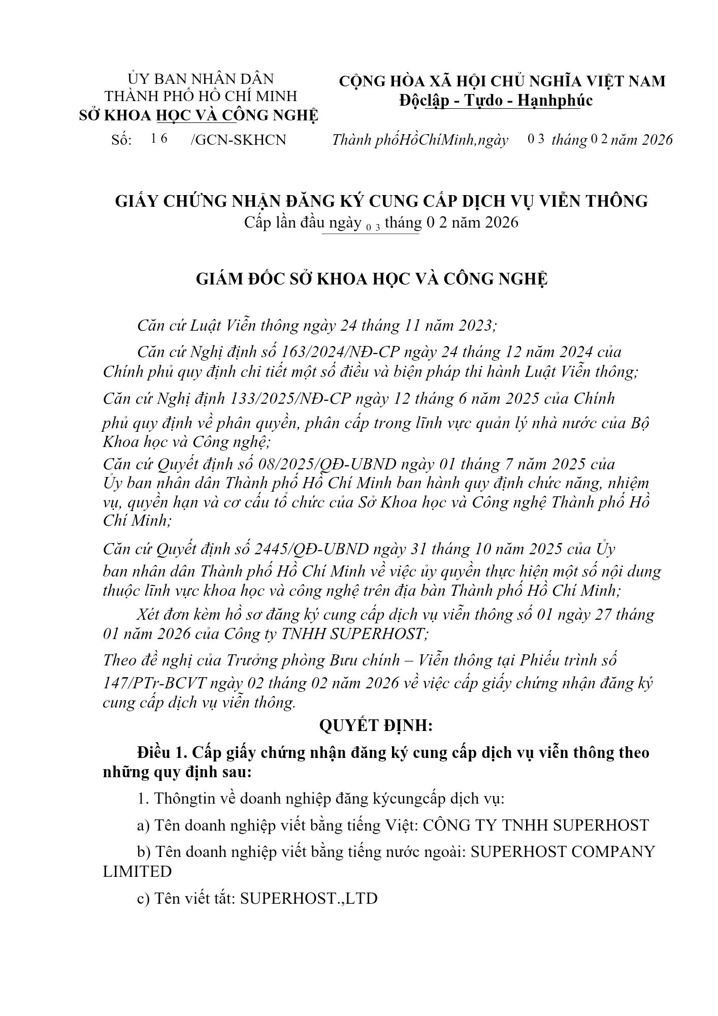 Ngày 03 tháng 02 năm 2026, Công ty TNHH SuperHost chính thức được Giám đốc sở Khoa học và Công nghệ cấp giấy chứng nhận đăng ký cung cấp dịch vụ viễn thông 2026.