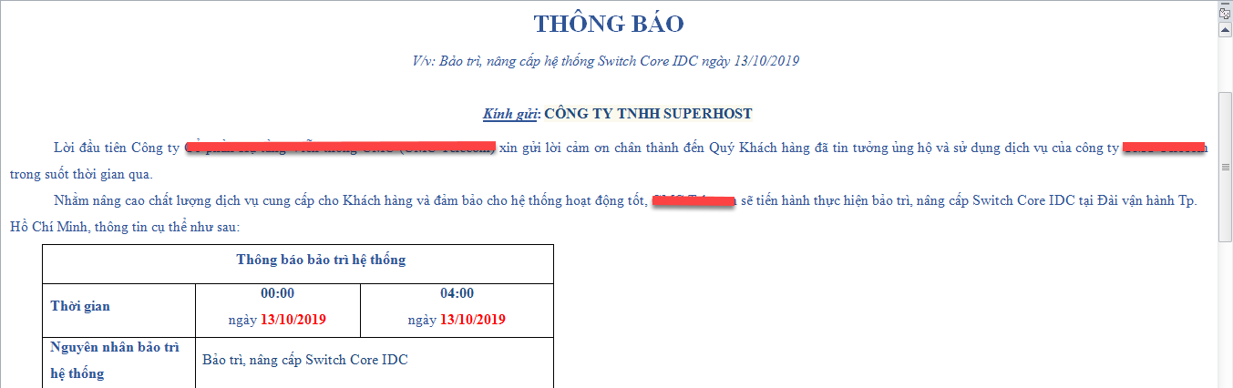 Thông báo bảo trì lần 1 từ Datacenter: